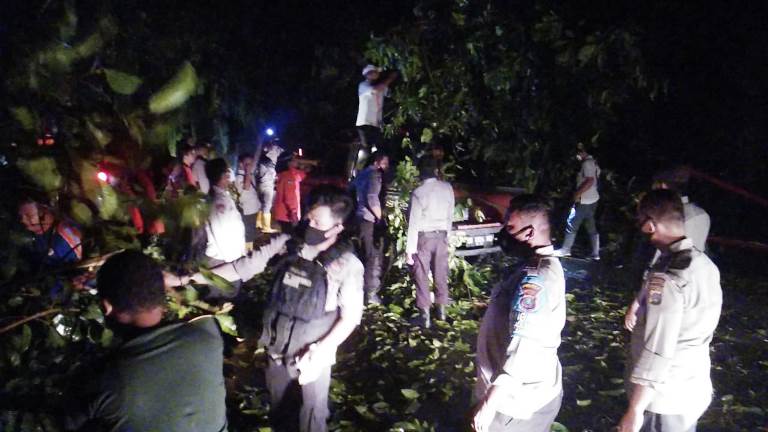 Saat ini petugas masih melakukan upaya pembersihan material longsor dan pohon tumbang yang menutupi badan jalan.