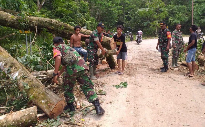 Babinsa Koramil 01/Barus bersama warga bergotong royong membersihkan badan jalan agar arus lalu lintas kembali pulih.