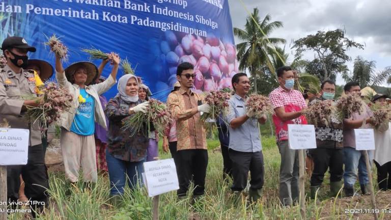 TAPANULIPOST.com – Kelompok Tani (Poktan) Simangornop, binaan Bank Indonesia Sibolga melakukan panen perdana demplot bawang merah di Desa Mompang, Kecamatan Padangsidimpuan Angkola Julu, Kota Padangsidempuan, Jumat (19/11/2021). Hasil panen tersebut cukup memuaskan, dengan produktivitas hasil sekitar 12 ton bawang merah pada lahan tanam seluas 6.000 meter.