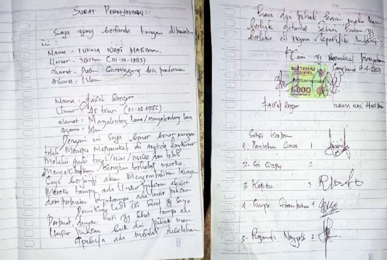 Selanjutnya, kedua pelaku membuat surat pernyataan bahwa mereka mengakui perbuatannya telah menipu masyarakat Kecamatan Angkola Sangkunur melalui judi Togel, Kim dan Macao, dan bersedia mengembalikan kerugian masyarakat.