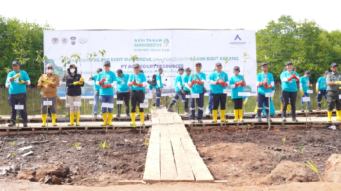 TAPANULIPOST.com – Agincourt Resources kembali menunjukkan komitmennya dalam melestarikan lingkungan hidup. Kali ini, melalui kolaborasi dengan Kementerian Lingkungan Hidup dan Kehutanan, pengelola Tambang Emas Martabe itu merambah perairan pantai dengan menanam 30.000 bibit mangrove di lahan seluas 10 hektar dan melepas puluhan ribu kerang di Tapanuli Tengah, Sumatra Utara.