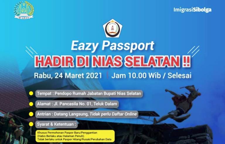 Pada hari ini, Rabu (24/3/2021), layanan Eazy Passport hadir di Kabupaten Nias Selatan. Warga yang ingin mengurus paspor diminta untuk memanfaatkan kesempatan ini.