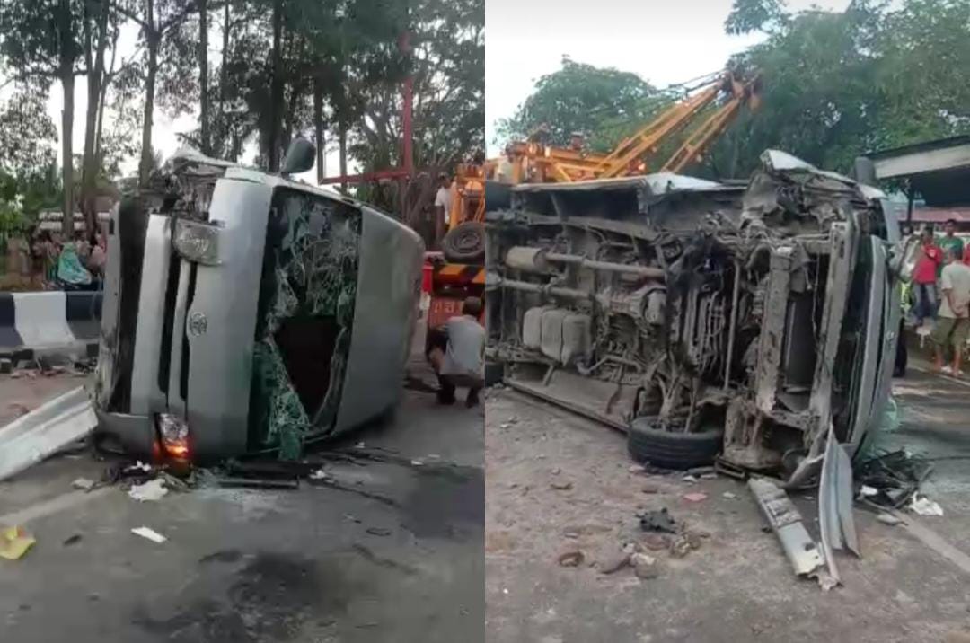 Video itu menunjukkan mini bus Tiomaz Trans tersebut dalam posisi terbalik dan sedang dilakukan evakuasi menggunakan mobil derek.