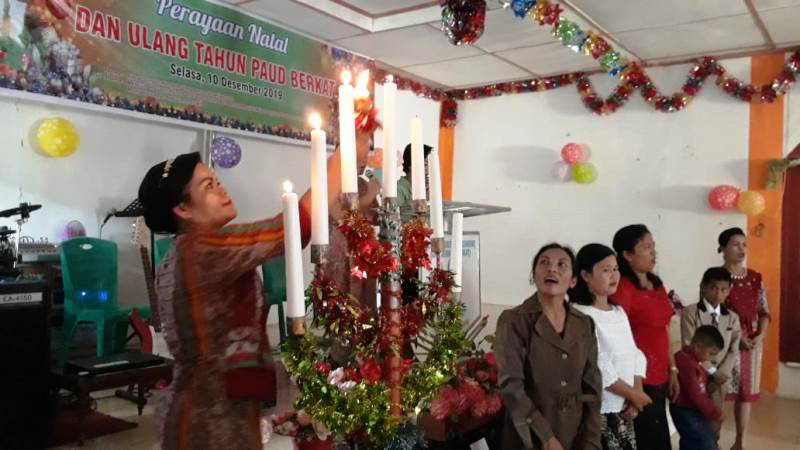 Foto: Kepala Sekolah PAUD Berkat, Pdt Larisma Sibarani menyalakan lilin Perayaan Natal.