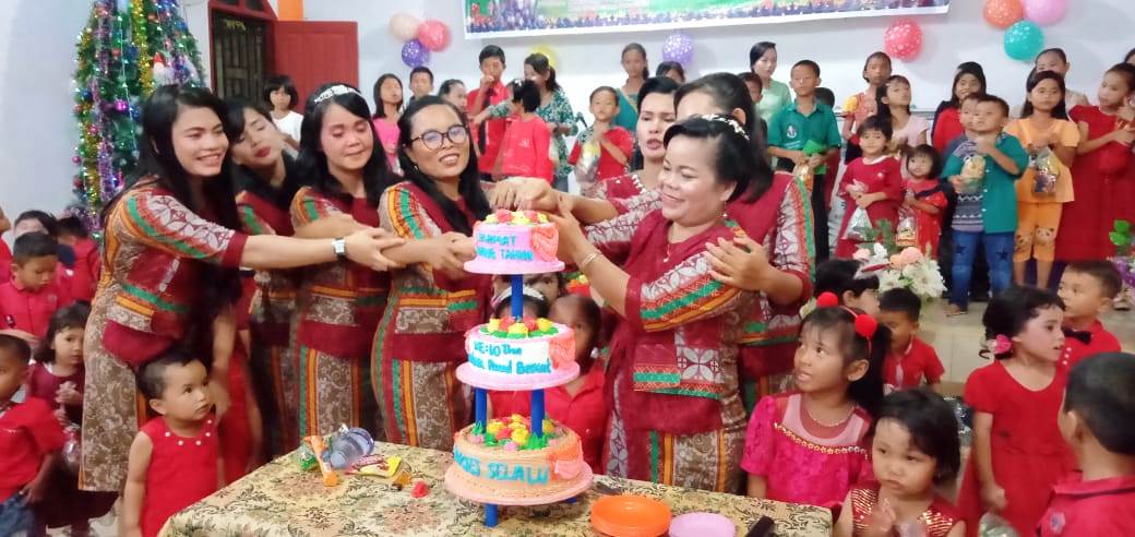 Foto: Kepala Sekolah PAUD Berkat, Pdt Larisma Sibarani didampingi para Tenaga Pendidik memotong kue Ulang Tahun.
