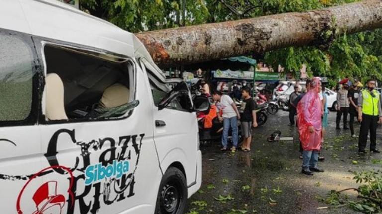 Salah satu mobil yang tertimpa pohon itu jenis Hiace Toyota putih dengan tulisan, ‘Crazy Rich Sibolga’. Sementara satunya lagi mobil Avanza hitam.