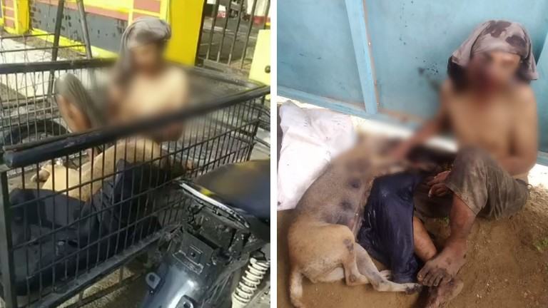 Dalam video yang beredar di media sosial, tampak pelaku babak belur diatas becak bersama seekor anjing curiannya.