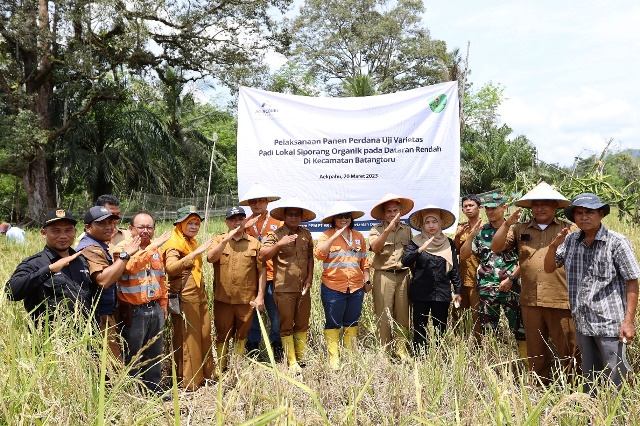 TAPANULIPOST.com – PT Agincourt Resources (PTAR) bekerja sama dengan Dinas Pertanian Tapanuli Selatan, Balai Penyuluh Pertanian Batangtoru, kelompok tani binaan, dan para pemangku kepentingan terkait, telah melakukan panen perdana uji varietas benih padi organik Siporang di area persawahan Kelompok Tani Aek Pahu, Desa Napa, Kecamatan Batangtoru, pada hari Senin (20/3). Hasil panen perdana ini mencapai 5,2 ton/ha.