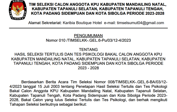 TAPANULIPOST.com – Tim seleksi (Timsel) telah mengumumkan nama calon anggota KPU kabupaten/kota di Sumatera Utara (Sumut) Periode 2023-2028, yang lulus seleksi tertulis dan tes psikologi. Namun, tidak ada satupun nama Anggota KPU Tapanuli Tengah (Tapteng) selaku Petahana yang lulus dalam seleksi ini.